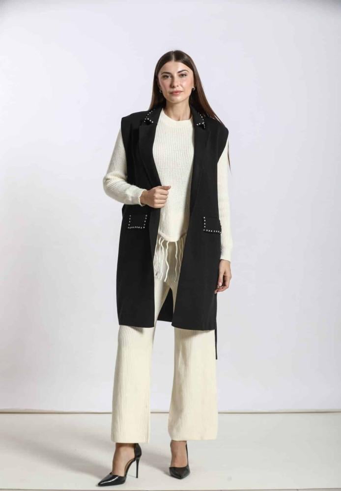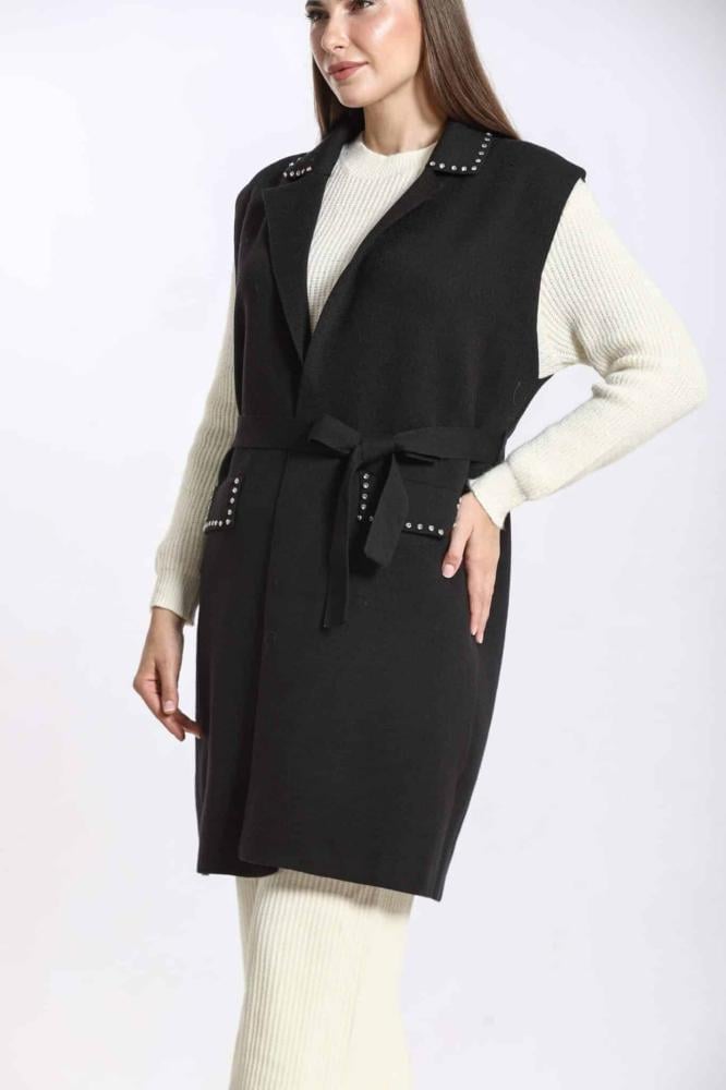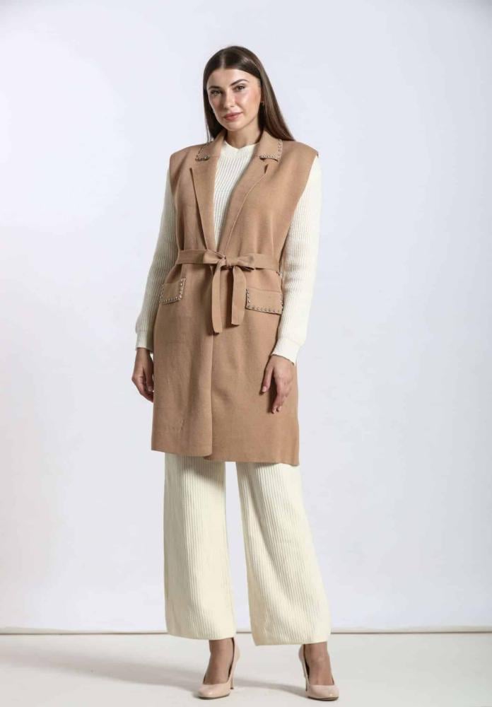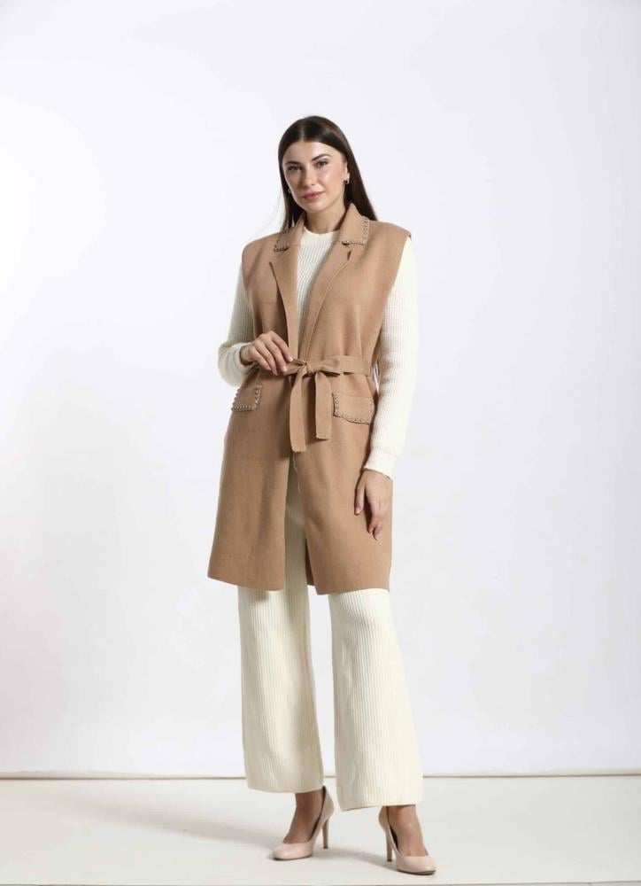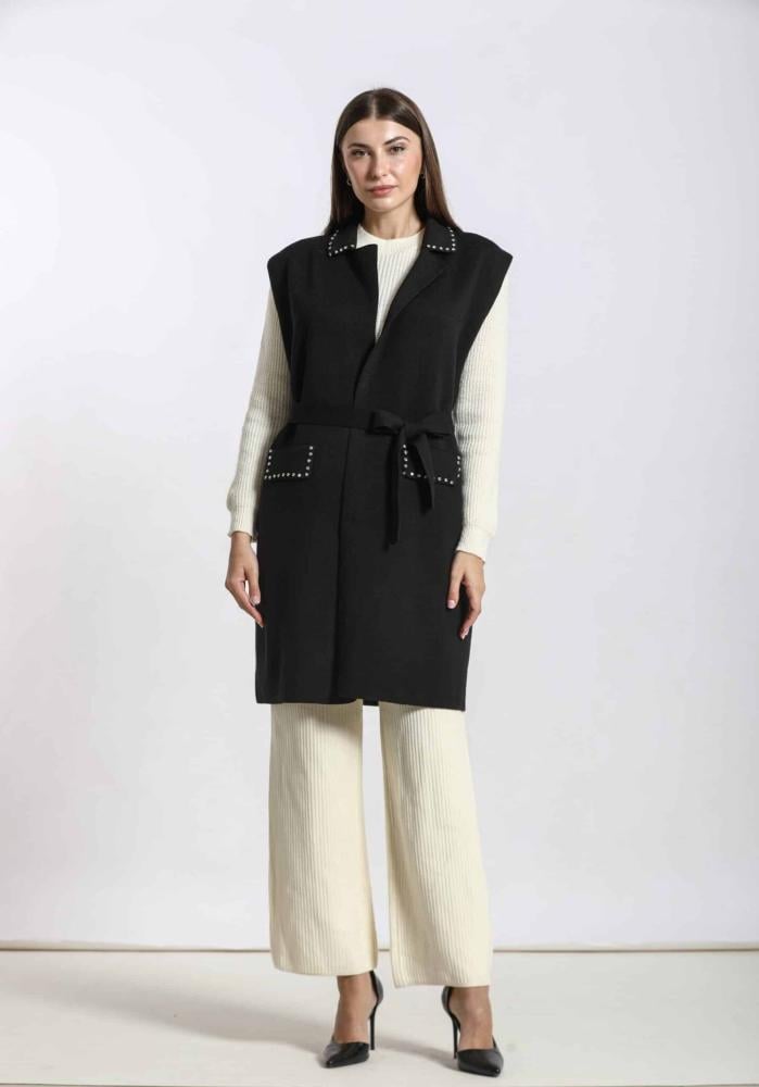 هذا الجاكيت الشتوي السادة بدون أكمام يتميز ببساطة التصميم ويأتي مع حزام، مما يضفي لمسة أنيقة وملفتة. يتمتع ببياقة مزينة بالكريستال مما يضيف لها جاذبية إضافية ويمنحها لمسة فخامة في الإطلالة الشتوية.