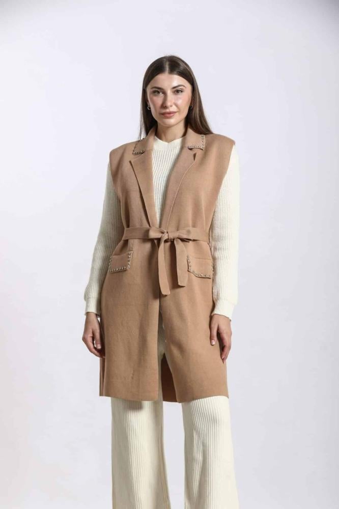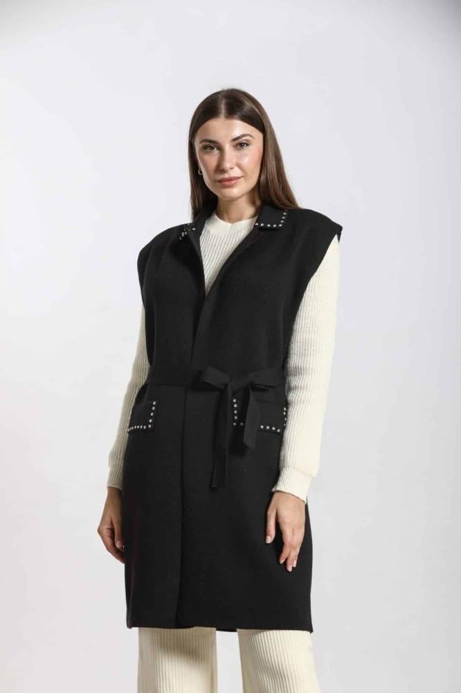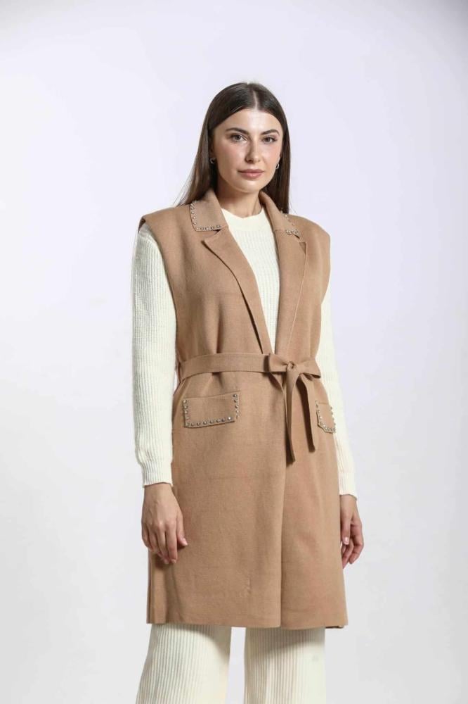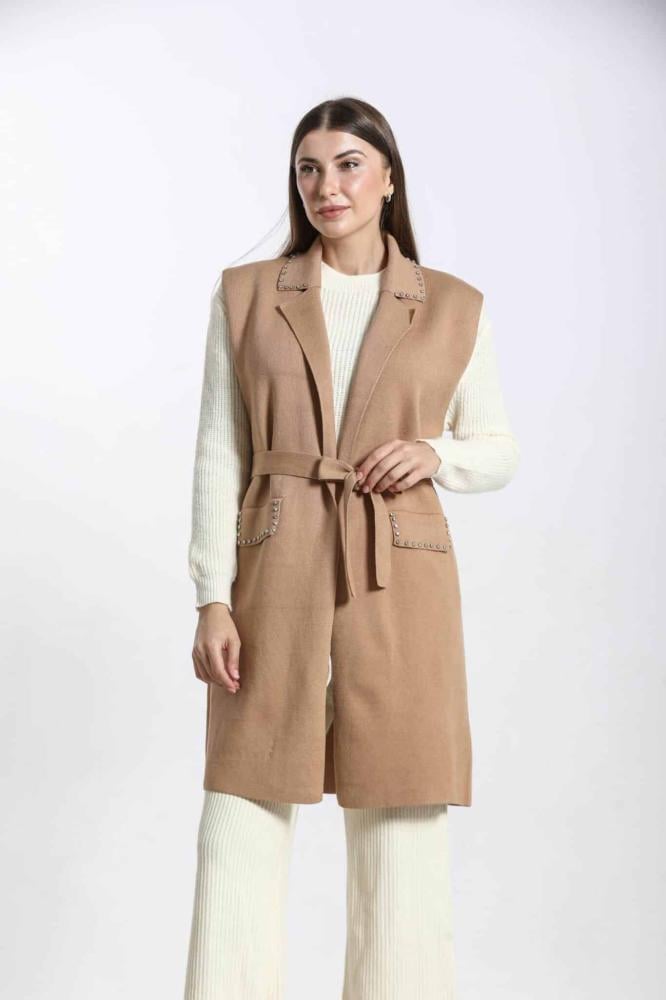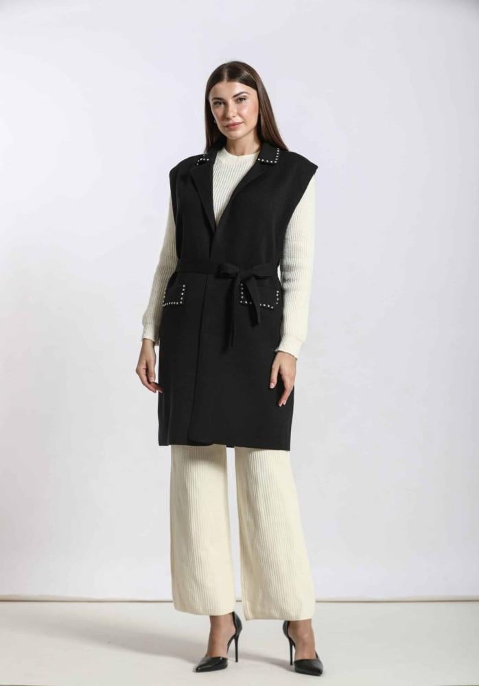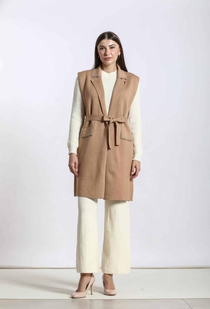 هذا الجاكيت الشتوي السادة بدون أكمام يتميز ببساطة التصميم ويأتي مع حزام، مما يضفي لمسة أنيقة وملفتة. يتمتع ببياقة مزينة بالكريستال مما يضيف لها جاذبية إضافية ويمنحها لمسة فخامة في الإطلالة الشتوية.