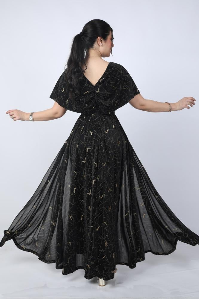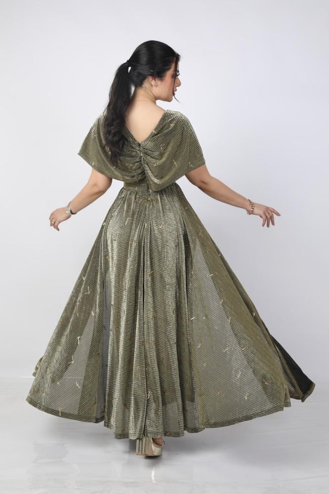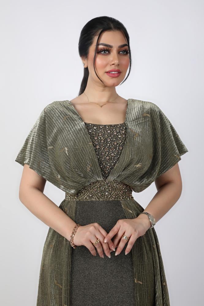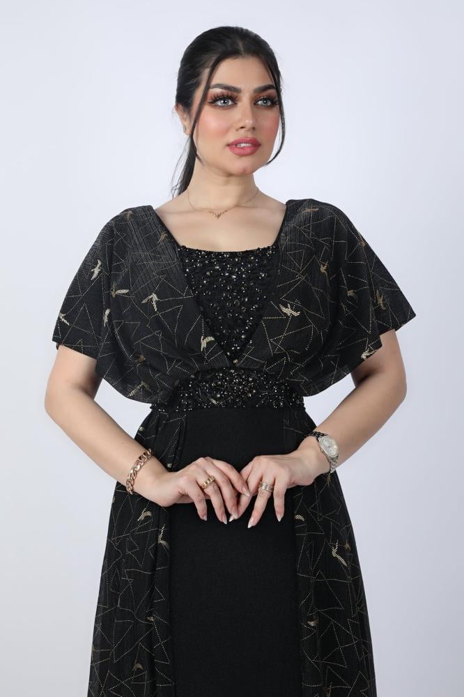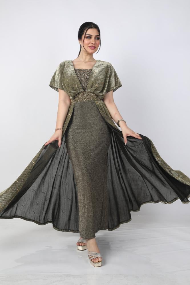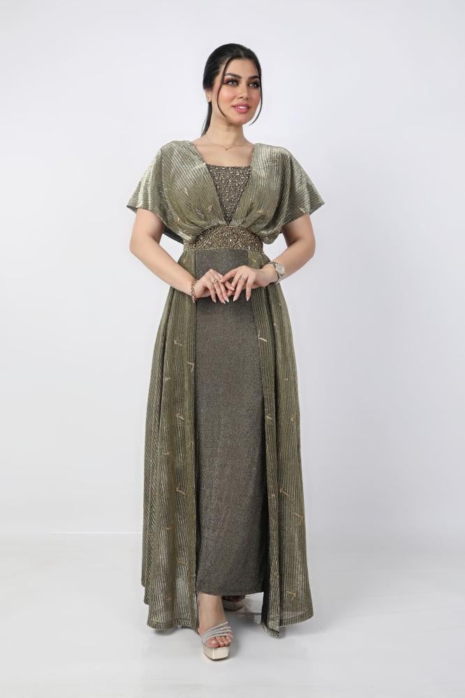 فستان سهرة أنيق طويل مزين بالكريستال على الخصر والصدر ومطرز بماء الذهب منسدل بشكل يعطي للجسم تناسق مثالي متوفر بلونين ورائع للمناسبات والسهرات