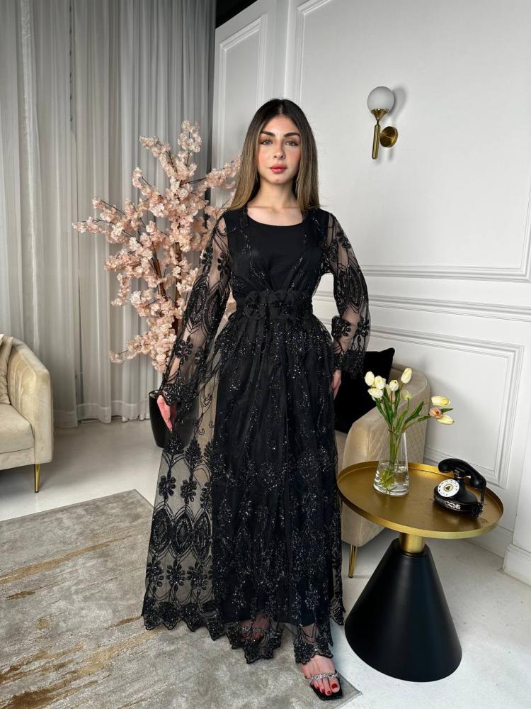 فستان اسود طويل بكم كت