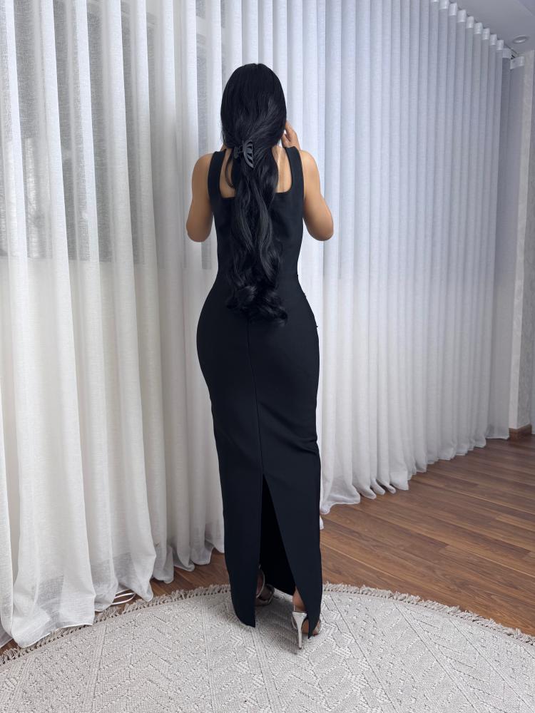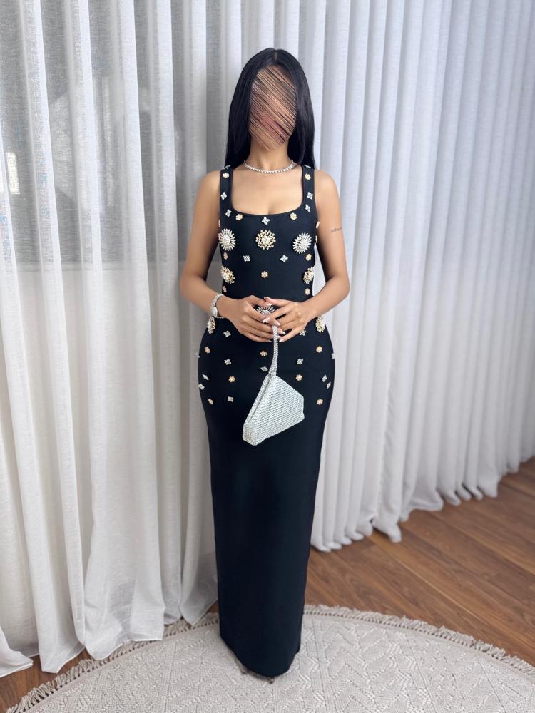 فستان  طويل سترتش مزين بحجار الكرستال